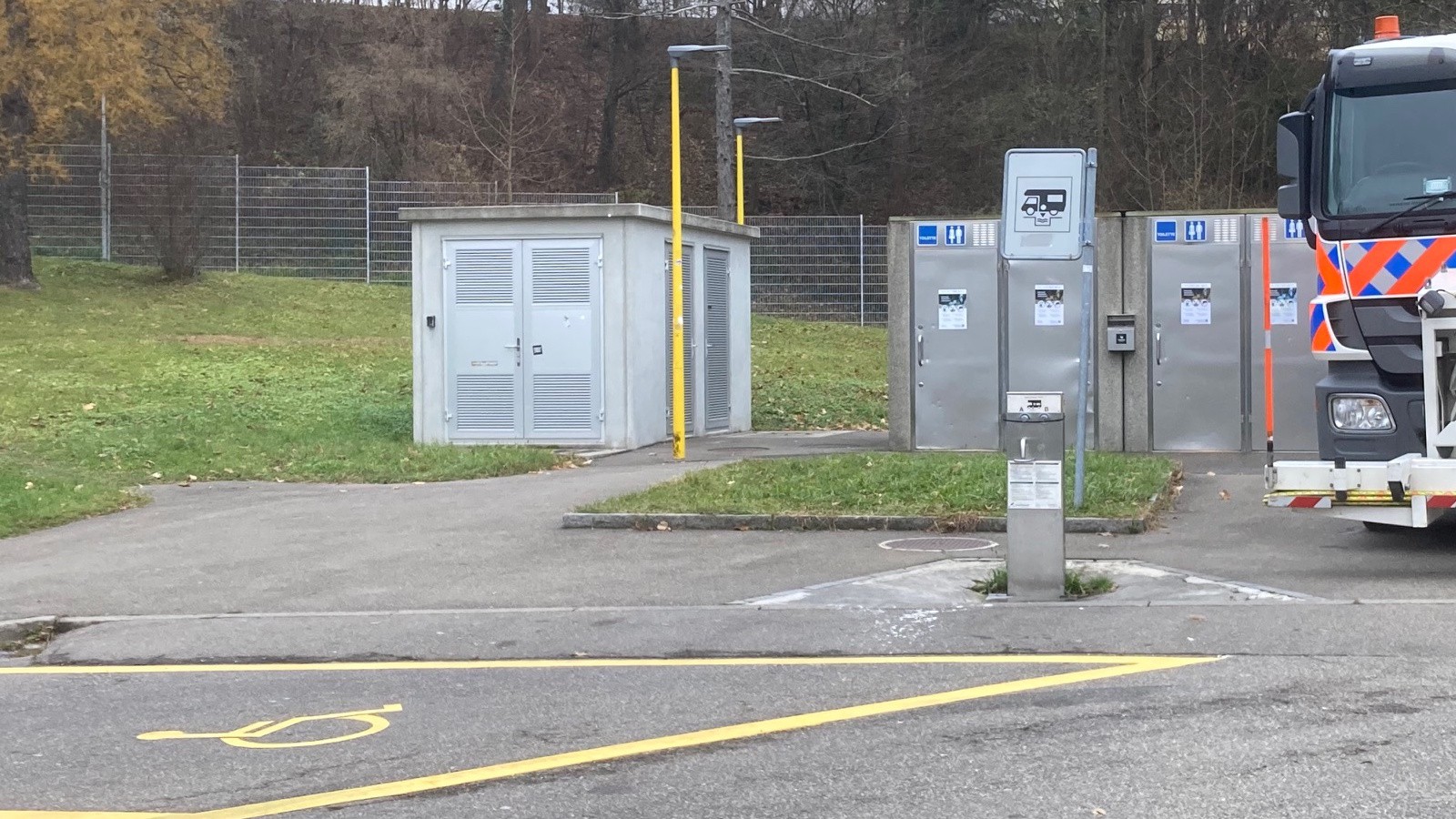Entsorgungsstation ist Richtung Bern, aber man kann sie von beiden Richtungen anfahren. Achtung! Bei regennasser Rinne spulen die Antriebsräder in der Chromstahl-Rinne durch und man steckt fest.