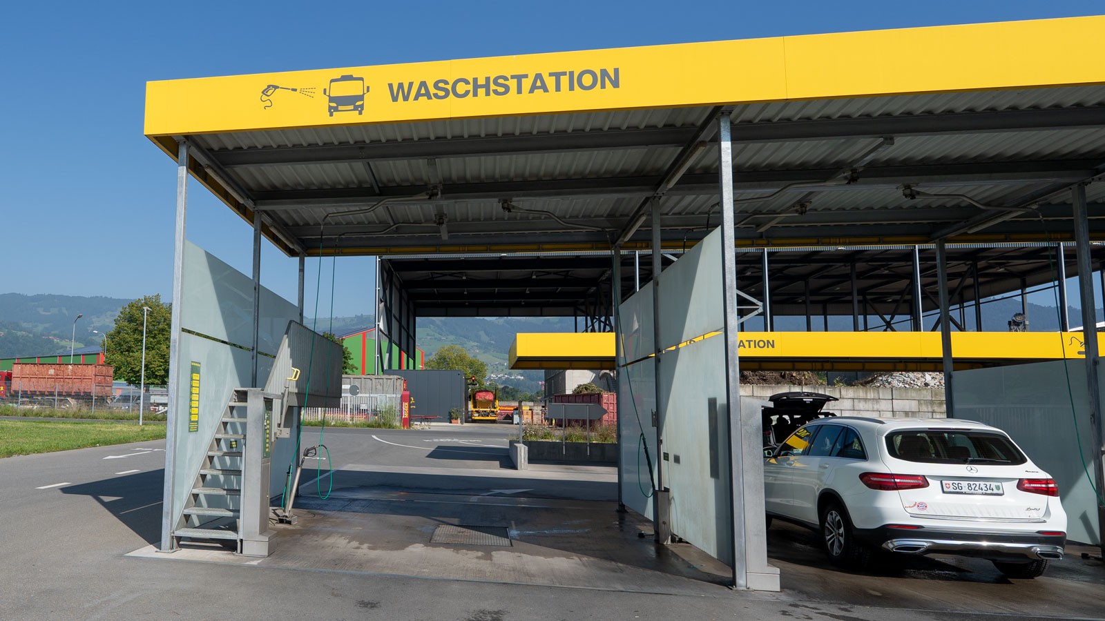 Grosszügige Waschbox ohne Dach mit seitlicher, begehbarer Rampe um das Dach zu waschen.