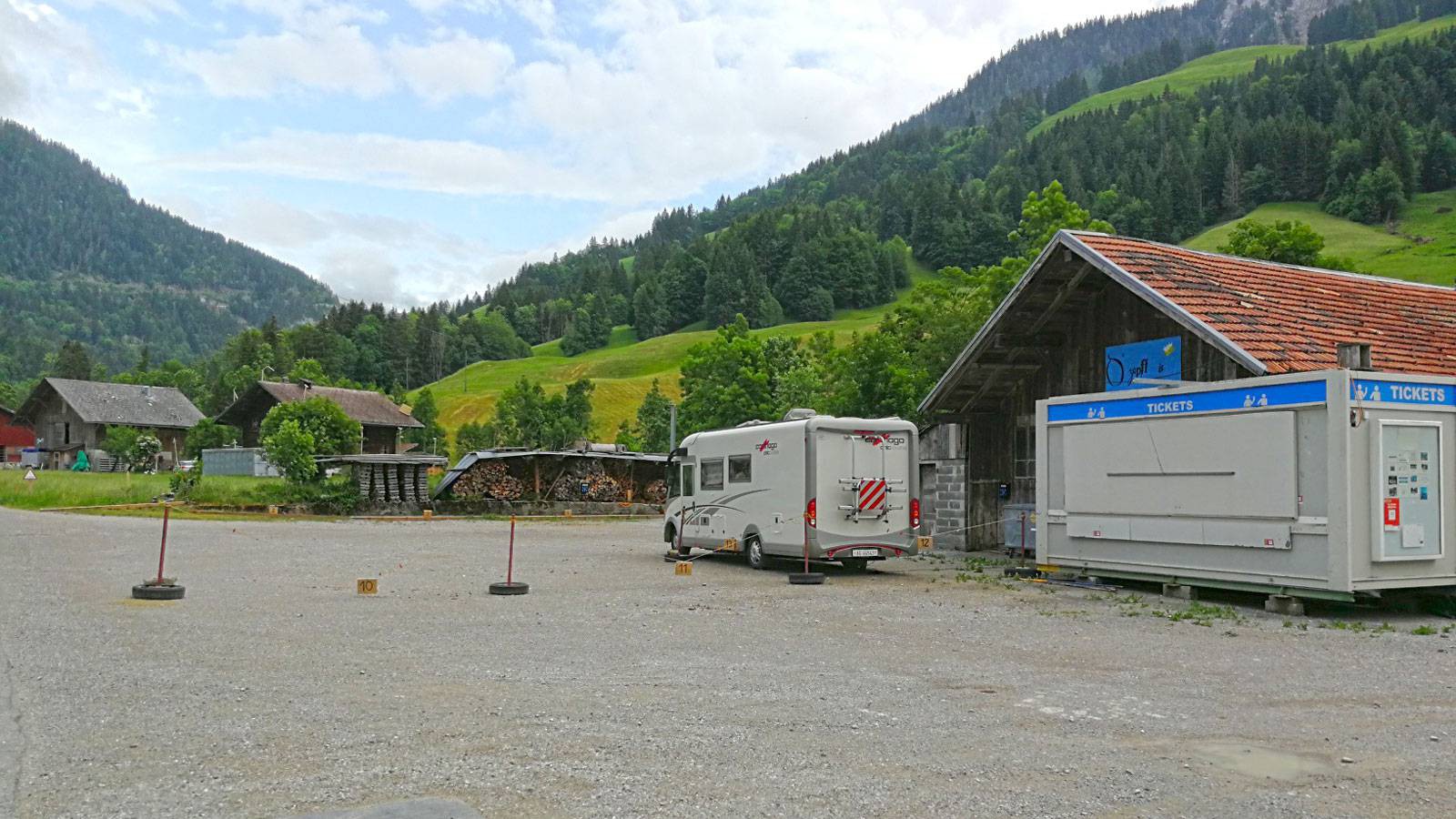 " Die Fotos stimmen schon. Der normale Parkplatz darf von Campingbussen zum Übernachten genutzt werden, ohne Strom und Dusche, für Fr. 18 die Nacht.Die grösseren Wohnmobile müssen den parzellierten Kiesplatz, rund um die Scheune benützen, mit Strom, WC, Dusche. Wir müssen nun viel bezahlen, für etwas, das von den Campern mit Bussen immer gefordert wurde, und diejenigen mit eigenen Sanitäreinrichtungen gar nicht benötigen. VE und Strom würden genügen.Natürlich sind wir für jeden neuen Stellplatz dankbar, aber nicht zu jedem Preis. So war dann der Stellplatz am sonnigen Wochenende verdächtig schwach besucht. Vielleicht wurde doch eher der günstigere Campingplatz vorgezogen und auch der einige Kilometer weiter unten liegende Stellplatz in Charmey war voll. "
