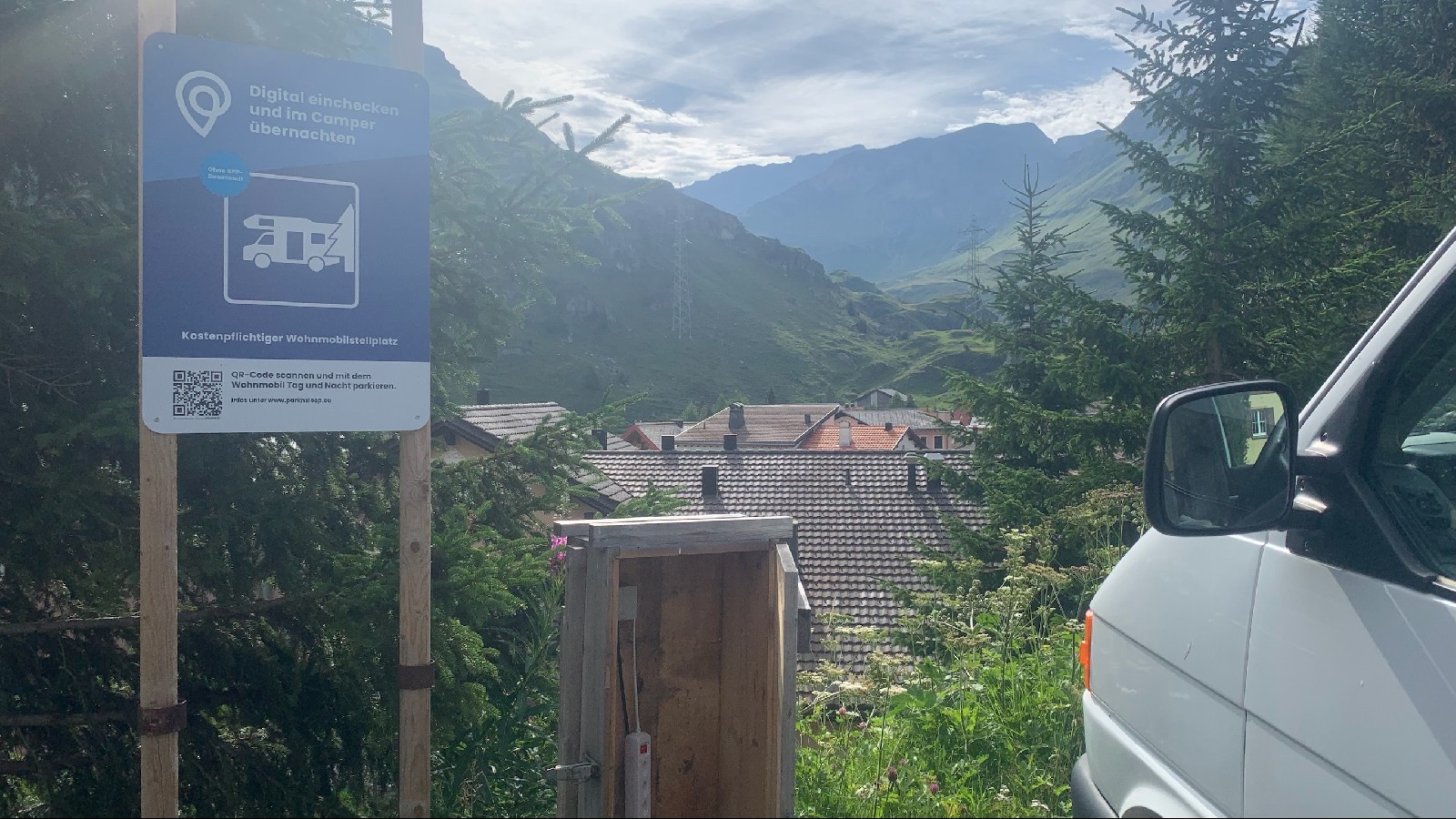 Der Platz hat leichtes Gefälle. Bei grösseren Womos bitte zuerst anrufen, eventuell ist es möglich zu parken.