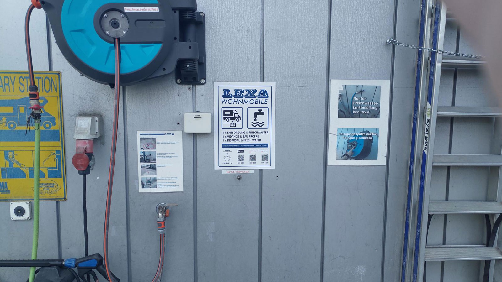 " Freundlicher Empfang mit grosszügiger Entsorgungsstation. Als wir dort waren hatte es 3 Stellplätze die zur Verfügung standen. Für jeden WOMO-Fan lohnt sich der Rundgang auf dem Platz. "