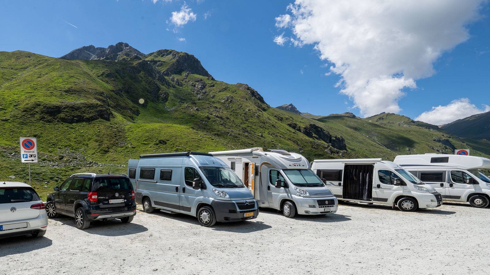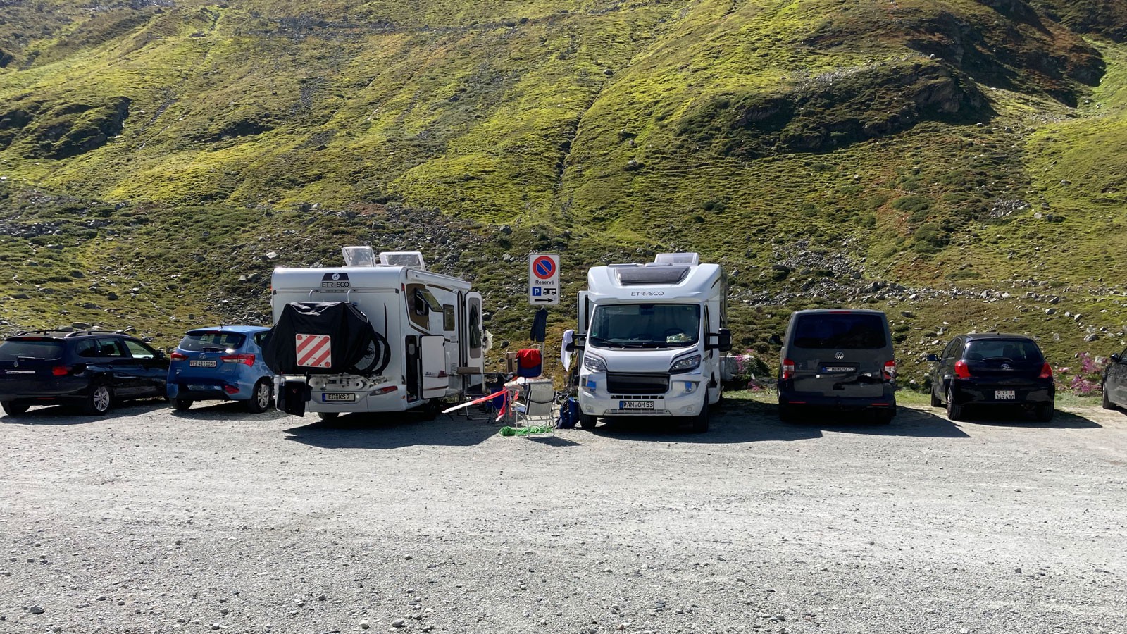 Parkplatz mit für Wohnmobile reserviertem Bereich. Grauwasserentleerung mittels Eimer, öffentliches WC und WC-Entleerung vorhanden
