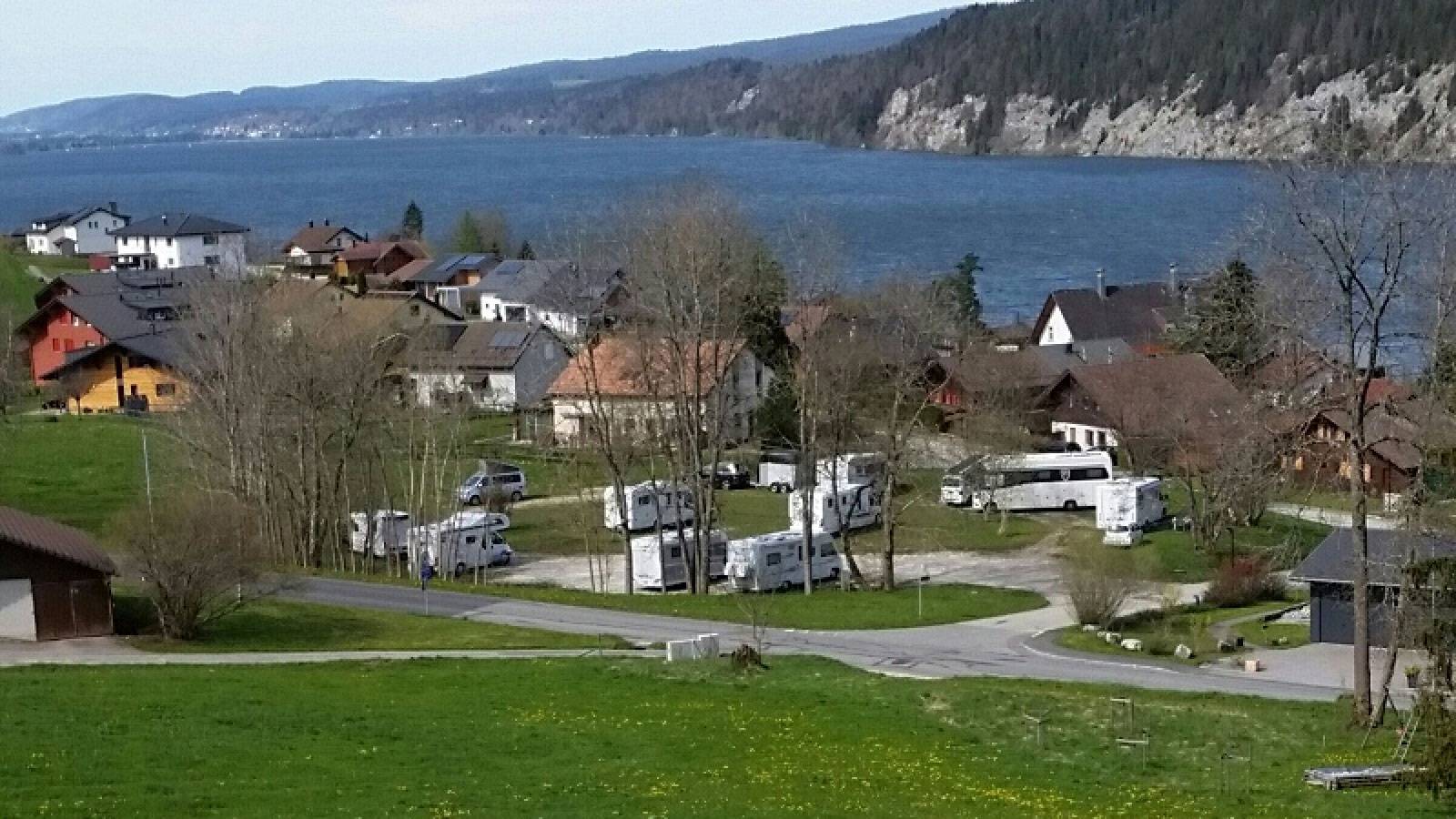 Platz am Rande der Straße, die in Richtung Col du Mollendruz hinaufführt, 300 Meter oberhalb des Seeufers. Das Dorf Le Pont bietet Geschäfte, Restaurants und ein Tourismusbüro, das zu Fuß oder mit dem Fahrrad in wenigen Minuten zu erreichen ist.