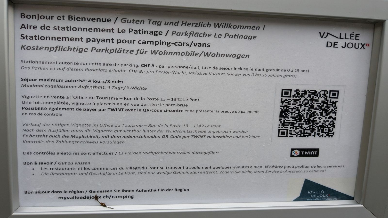 " Vielen Dank der Gemeinde für die tollen Stellplätze rund um den Lac de Joux. Wir haben hier 2x übernachtet. Tagsüber etwas Strassenlärm, nachts ruhig. Bezahlt haben wir im kleinen Info-/Lebensmittelladen in Le Pont / L'Abbaye (Stand: 08.06.2021). "