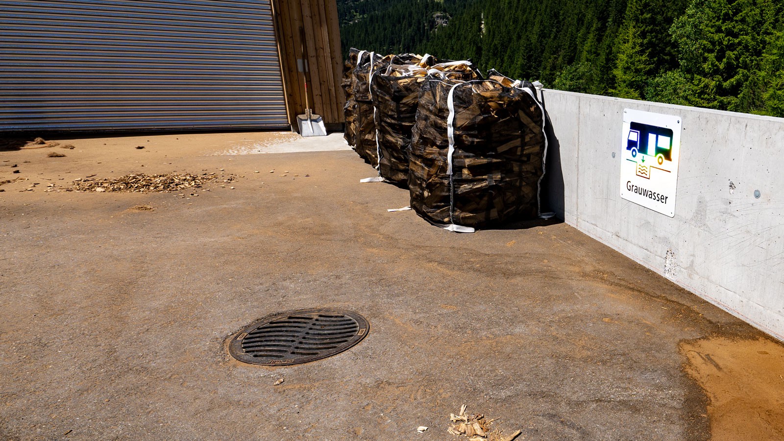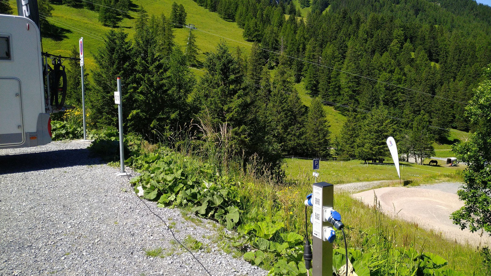 " Sehr gut ausgestatteter Stellplatz auf einem abgesperrten Teil des Parkplatzes P2. Direkte Aussicht in die Berge. Ver-/ Entsorgung ganz rechts beim Holzheizwerk.Beim Holzkraftwerk fährt zum Teil ein Pneubagger, um Schnitzel zu füllen. Je höher die Parkplatznummer, desto weiter weg vom Pneubagger. "