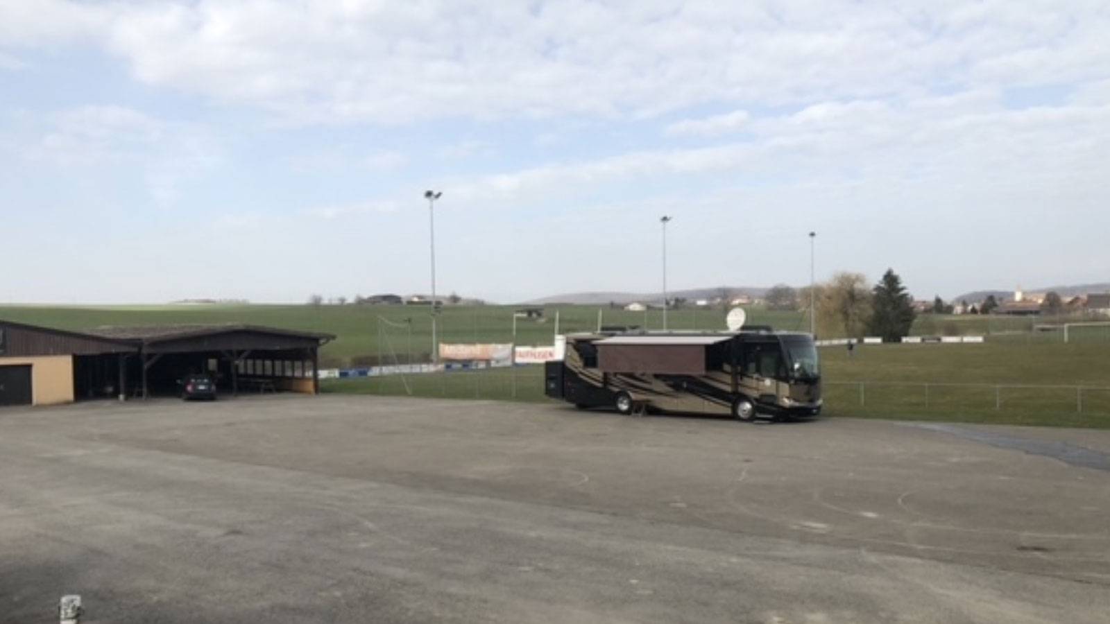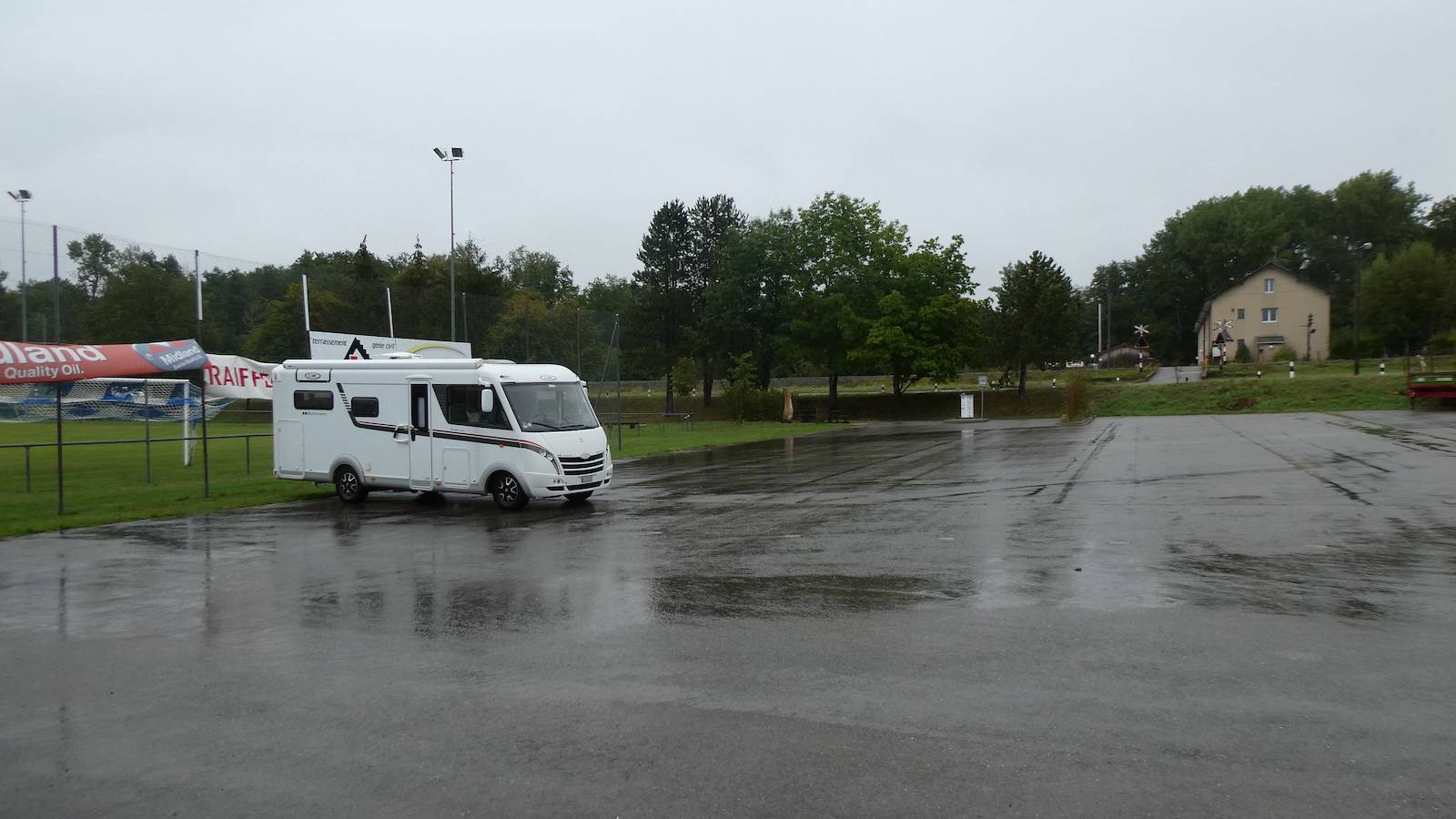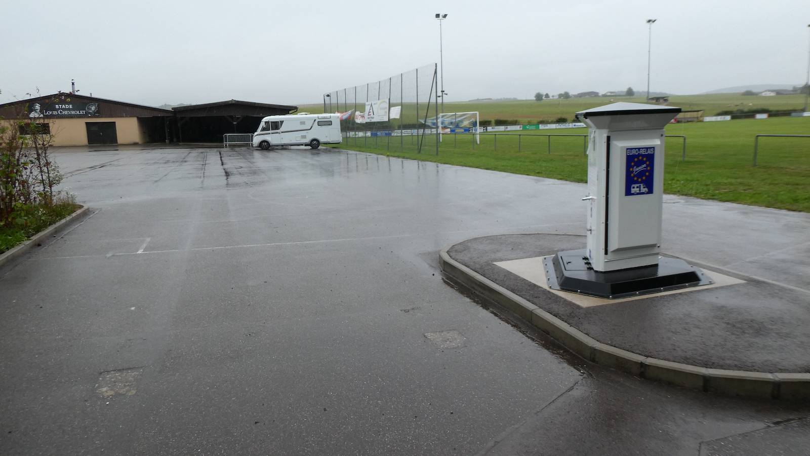 Aspaltierter Parkplatz unterhalb der Strasse neben dem Fussballplatz mit Eurorelais Säule. Strom und Trinkwasser mit Jeton, die neben dem Bahnhof in einem Automaten (produits du terroir) gekauft werden können. Am Platz überdachter Sitzplatz wie weitere Picknicktische. In nächster Nähe 2 Seen mit Rundwanderweg.
