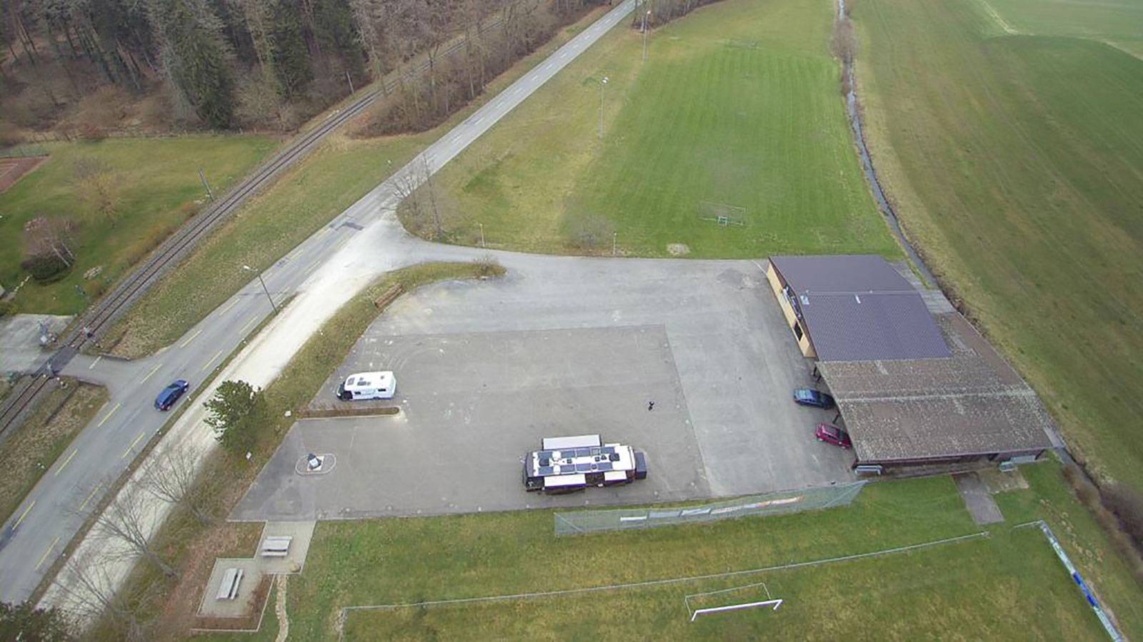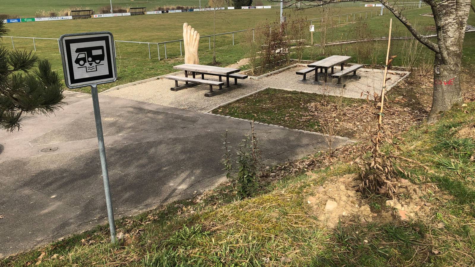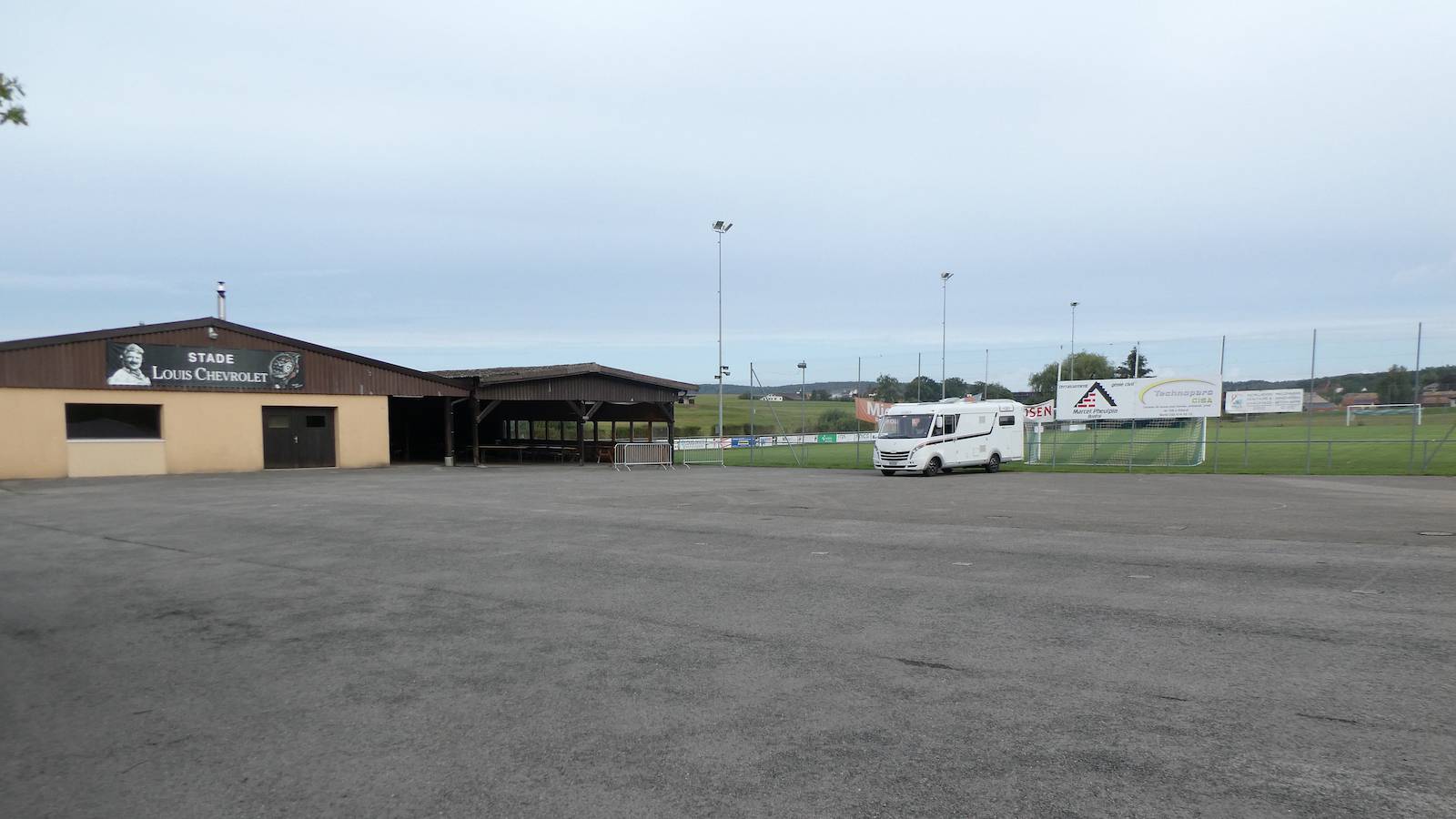 Aspaltierter Parkplatz unterhalb der Strasse neben dem Fussballplatz mit Eurorelais Säule. Strom und Trinkwasser mit Jeton, die neben dem Bahnhof in einem Automaten (produits du terroir) gekauft werden können. Am Platz überdachter Sitzplatz wie weitere Picknicktische. In nächster Nähe 2 Seen mit Rundwanderweg.