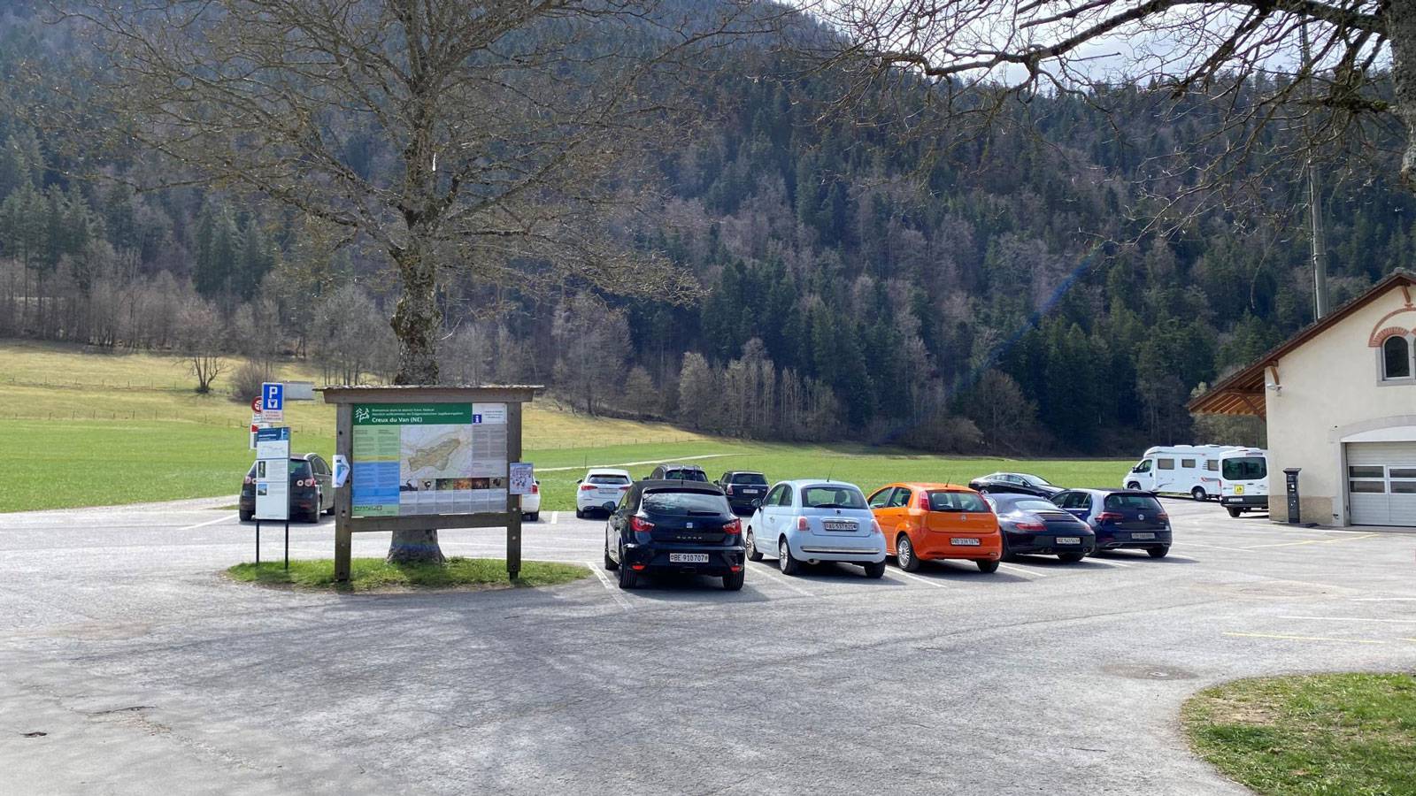 Devins-Parkplatz, für alle bewohnbaren Fahrzeuge und Wohnmobile, die die Nacht von 20 Uhr bis 8 Uhr morgens verbringen möchten. Wohnmobilstellplatz am Beginn der Wanderwege für die Gorges de l'Areuse und den Creux du Van. Es parken auch normale PW's.